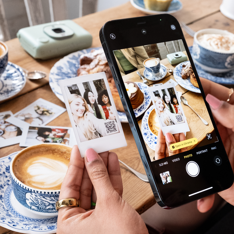 Wanneer je de QR-modus selecteert, neemt de instax mini LiPlay™ geluid op tijdens het maken van een foto. Op de print verschijnt een QR-code die je kan scannen met je telefoon om je herinnering terug te horen!